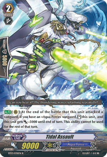 Next are the [1/turn] rulings. 1/turn wasn't an actual icon on cards before, but instead cards would say "This ability cannot be used for the rest of that turn." It is functionally 1/turn but it did have a slight change from modern Vanguard. If it is an Auto ability that meets its condition for the first time, you can only activate it the first time it would trigger. This matters for cards like Tidal Assault which can restand after it attacks the vanguard once per turn. You can avoid this restriction by attacking with it at the best moment, or by attacking a rearguard first since it can only activate from hitting a vanguard. Outside of some Aqua Force cards, most cards don't functionally change all that much.