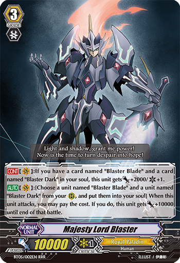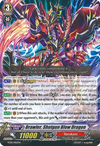 The entire format is built around the strong power bonuses of these break rides and dancing around giving the opponent 4 damage until you are ready to deal with their powerful turns. With the high power stock put on these break rides and boss units, most rearguards are really simple and are similar tools for most clans. This creates a dynamic where magic numbers, resource management, and damage control are more important than ever. If you give the opponent 4 damage too quickly, they may blow you out with their break ride. If you play down all your pieces too fast, you may run out of gas before the end of the game. Because of how little card advantage there is in the format, every single card you draw and how you use them is very important.